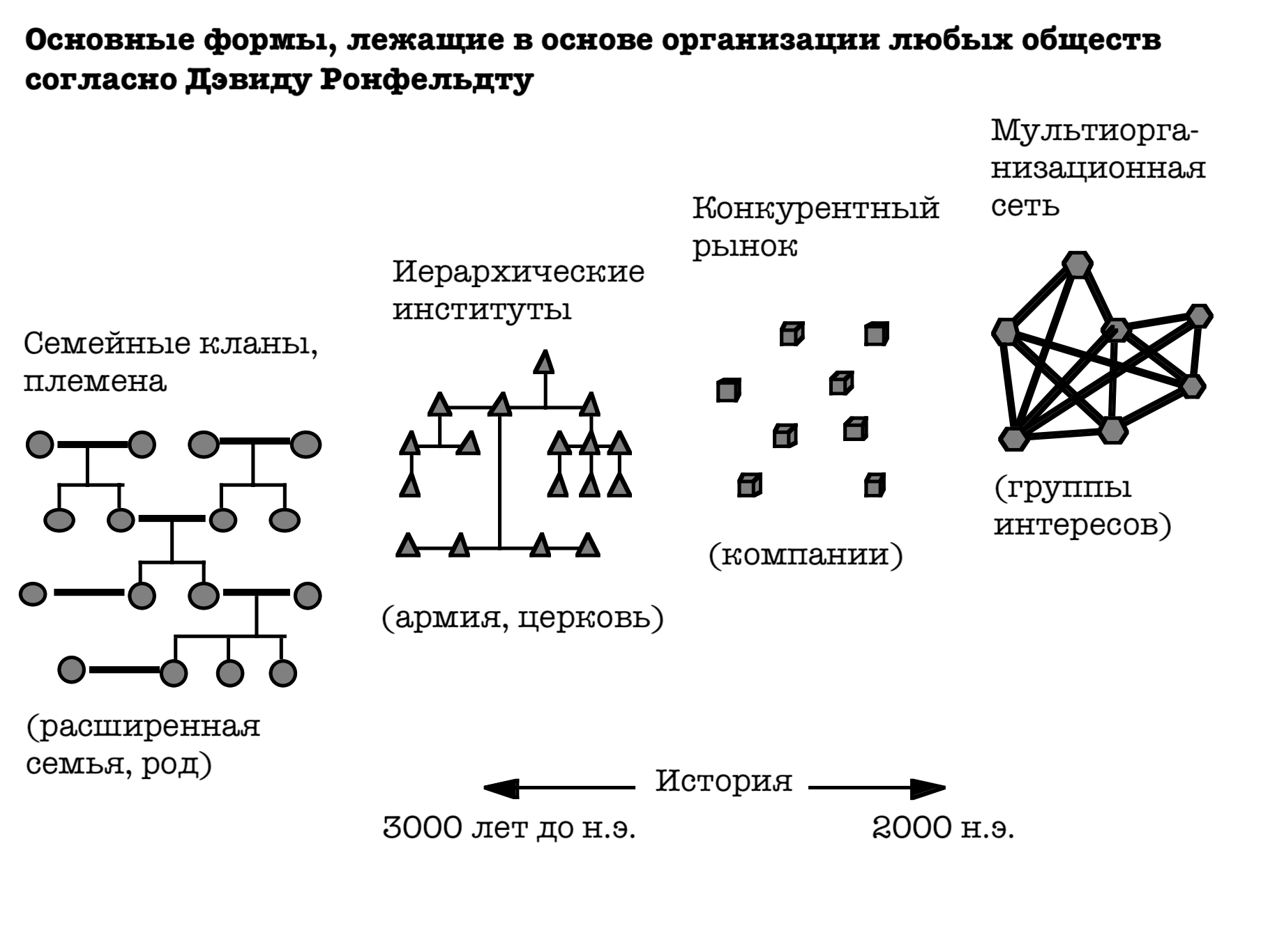 Актуализация иерархий (централизованных сетей) становилась возможной благодаря культурным достижениям, сначала письменности, а в ХХ веке – техническим достижениям: радио, телевидению, телефонии. И лишь в XXI веке они способствуют децентрализованным сетям.