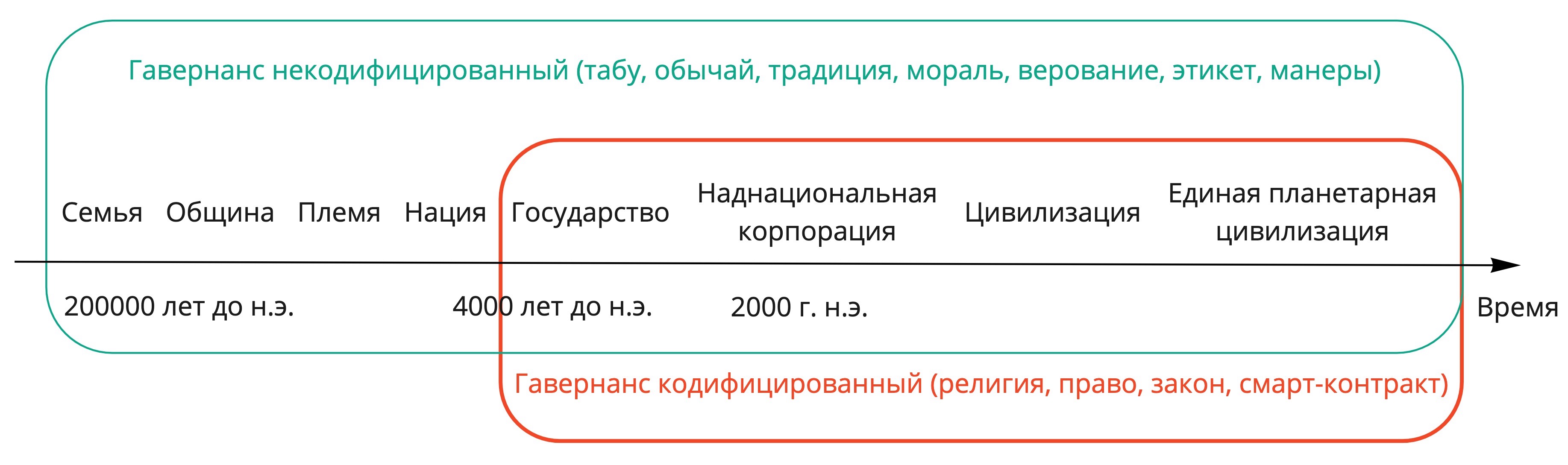 Инновацией ДАО является не структура, а способ кодификации гавернанса. Проще говоря, если раньше его шептали у костра, объявляли перед строем, вырезали в камне, провозглашали на ратушной площади, печатали на бумаге, читали по радио, то теперь его сохраняют в публичный распределённый реестр.