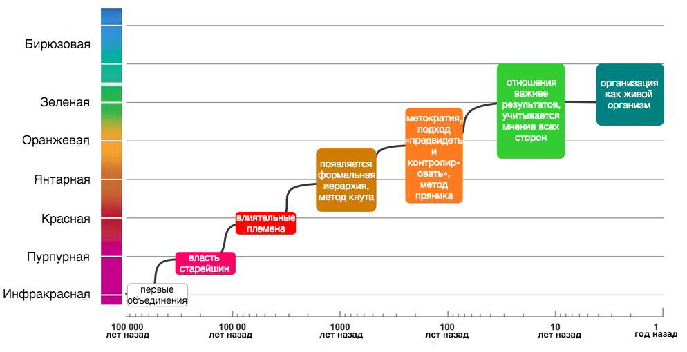 В 1966 году психолог Клер Грейвз озвучил теорию спиральной динамики, согласно которой индивид обладает внутренней способностью одновременно пребывать на разных уровнях психологического развития, а кроме того самостоятельно создавать такие уровни. Каждому уровню автор придал определенный цвет. В 2014 году писатель Фредерик Лалу применил этот принцип к развитию организационных структур. Он обнаружил, что в разных культурах и областях человеческой деятельности существуют организации, достигающие выдающихся успехов, и предположил, что это связано с их “духовным развитием”, присвоив им бирюзовый цвет.